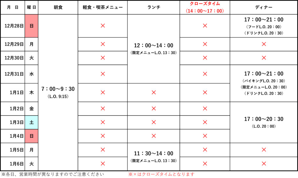 年末年始のホテル館内の営業につきまして、誠に勝手ながら下記のとおりとさせていただきますので、何卒よろしくお願いいたします。